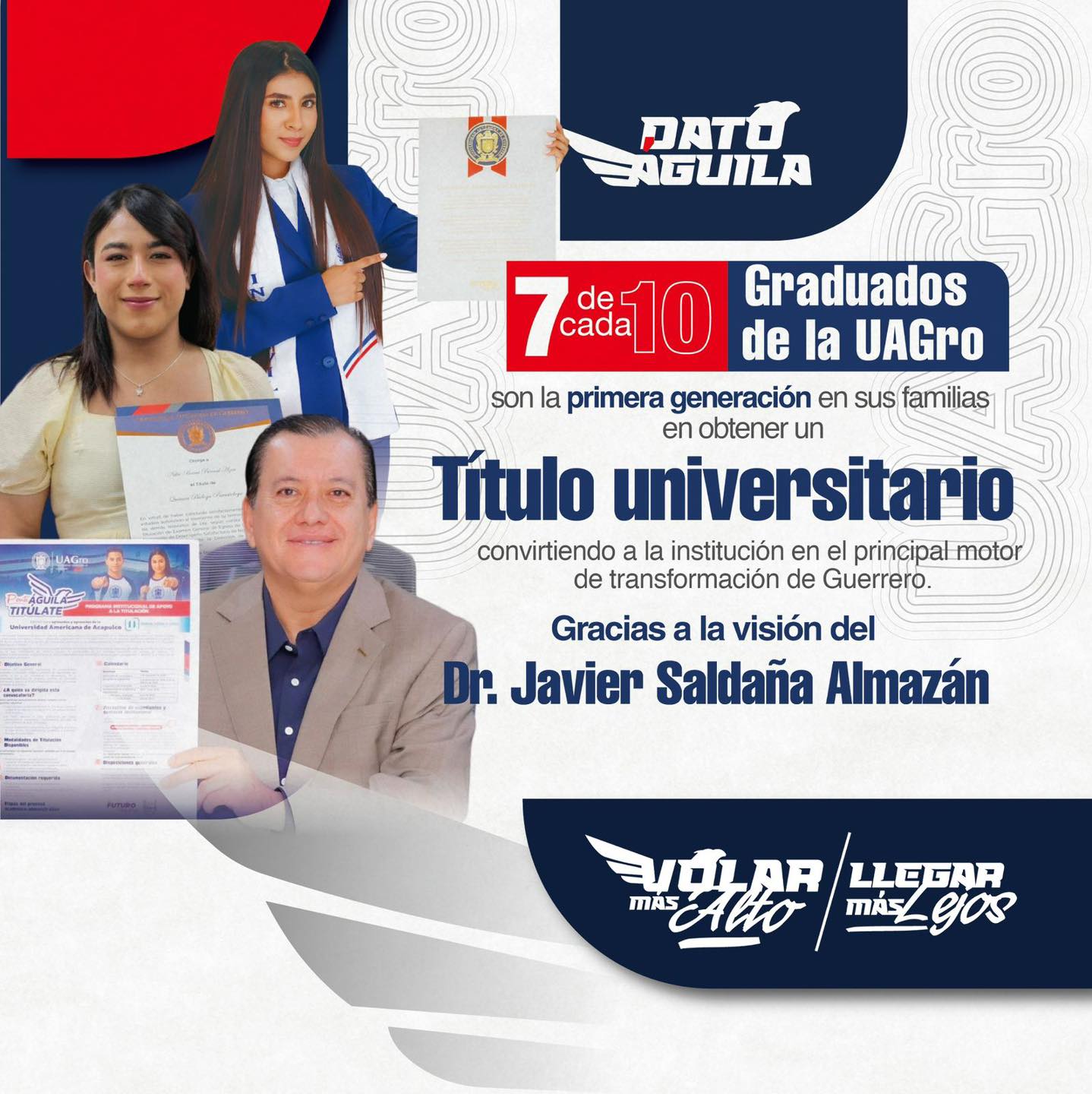En la UAGro, la educación abre caminos y transforma realidades. 🦅 Hoy, 7 de cada 10 egresados son la primera generación en sus familias en obtener un título universitario, un logro que refleja esfuerzo y nuevas oportunidades para llegar más lejos. 🎓💯 Este avance es resultado de una visión que impulsa la educación como motor de cambio, encabezada por el Dr. Javier Saldaña Almazán. Seguimos generando condiciones para que más jóvenes construyan un mejor futuro.